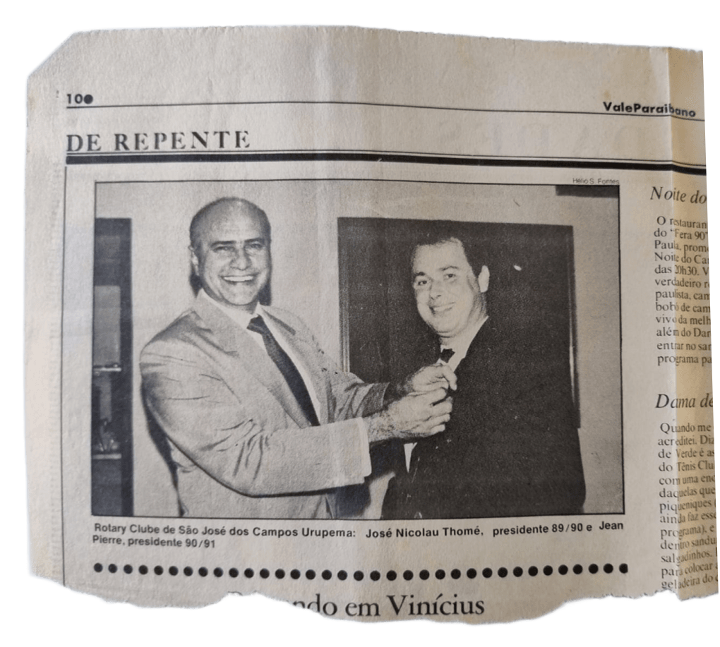 Na foto, José Nicolau Thomé, então presidente do Rotary Club em 1989 e 1990, transfere o título de presidente a Jean Pierre, que assumiu o cargo para o período de 1990 a 1991.